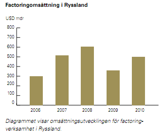 Factoringmarknaden i Ryssland uppgår till cirka 1,5 procent. Det finns dock bedömningar att factoringmarknaden kommer att uppgå till cirka 1 000 miljarder SEK om ett par år, att jämföras med nuvarande låga nivå om cirka 350 miljarder SEK.